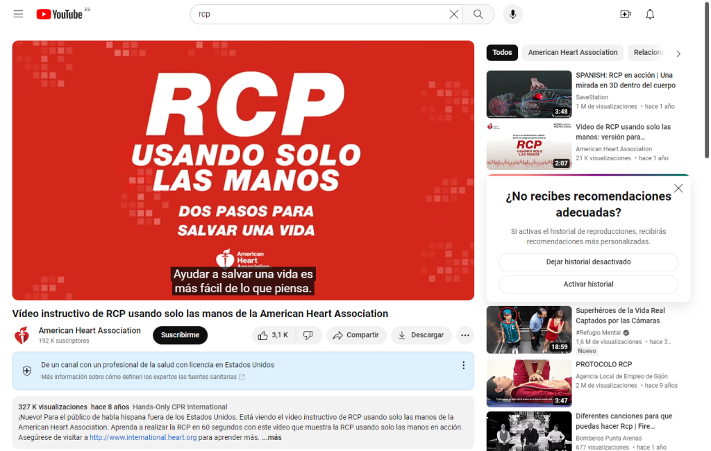 En el ejemplo expuesto, ha bastado con escribir «rcp» para que la plataforma nos devuelva una serie de videos «de fuentes sanitarias».